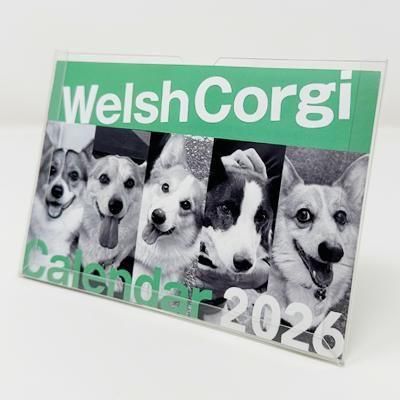 コーギー写真のみで制作された薄型ケースに入った2026年のコーギー卓上カレンダーです!