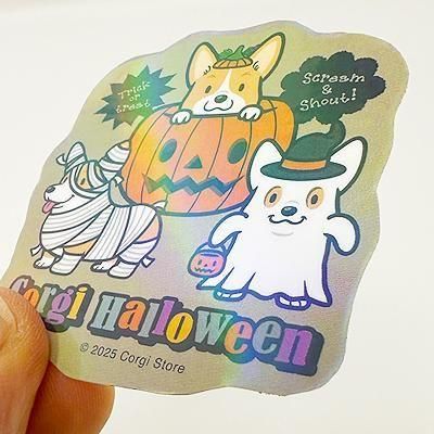 ハロウィンコーギーデザインのステッカーシールです。オーロラ加工が施してあるので、動かす度にキラキラと綺麗なシールとなっております!透明スマホケースに貼ったり、デコレーションしたり色々楽しんで下さいね!